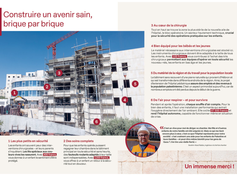 Pour mettre sur pied un centre chirurgical de jour, un nouveau bâtiment doit être construit sur le site de l’hôpital. Secours aux Enfants Bethléem prend en charge les frais de fonctionnement de l’hôpital, mais les travaux d’extension doivent être financés par des dons extraordinaires.