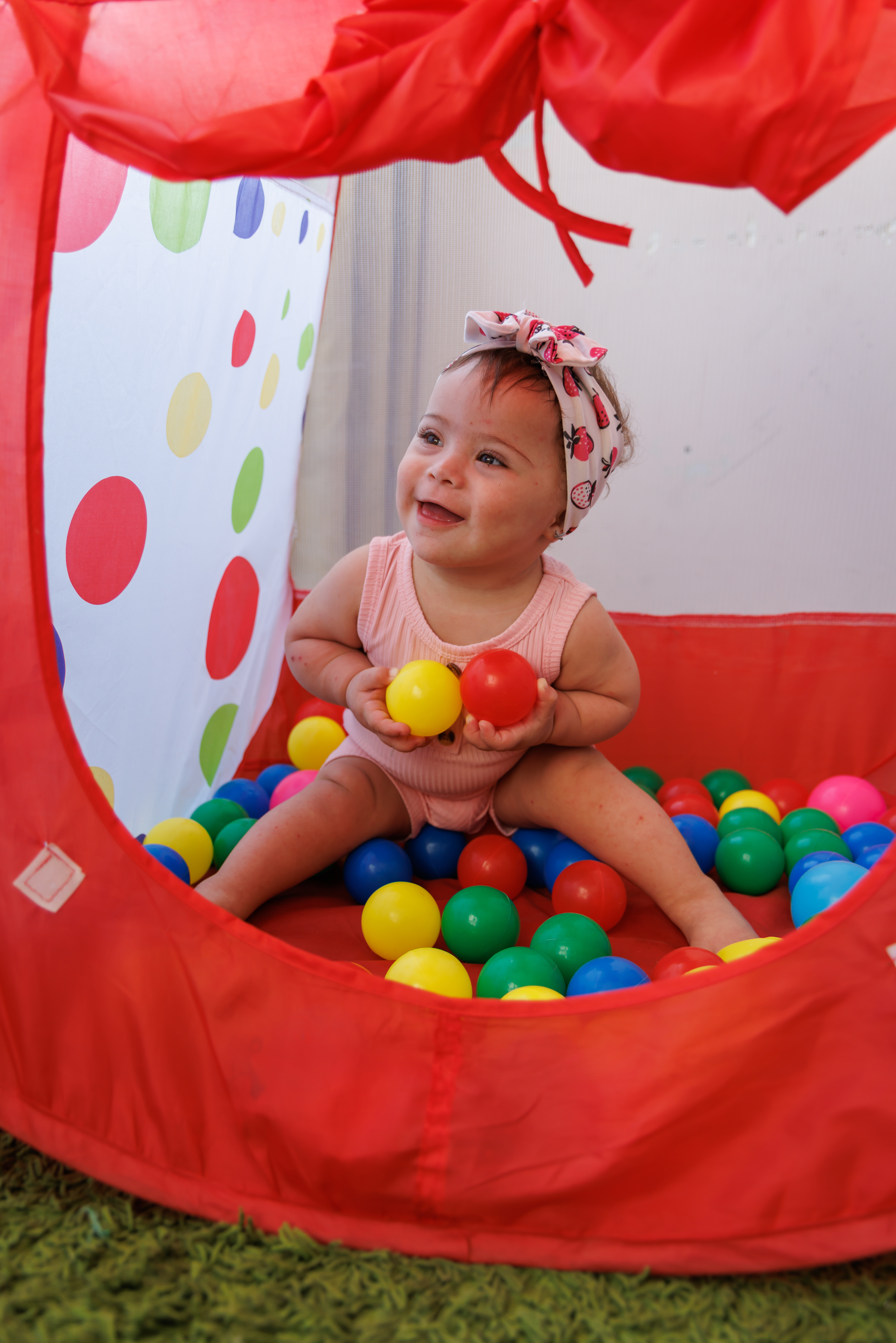 Ein farbenfrohes Bad in Bällen: Mit Freude und Energie erobert Karmel ihre kleine Welt.