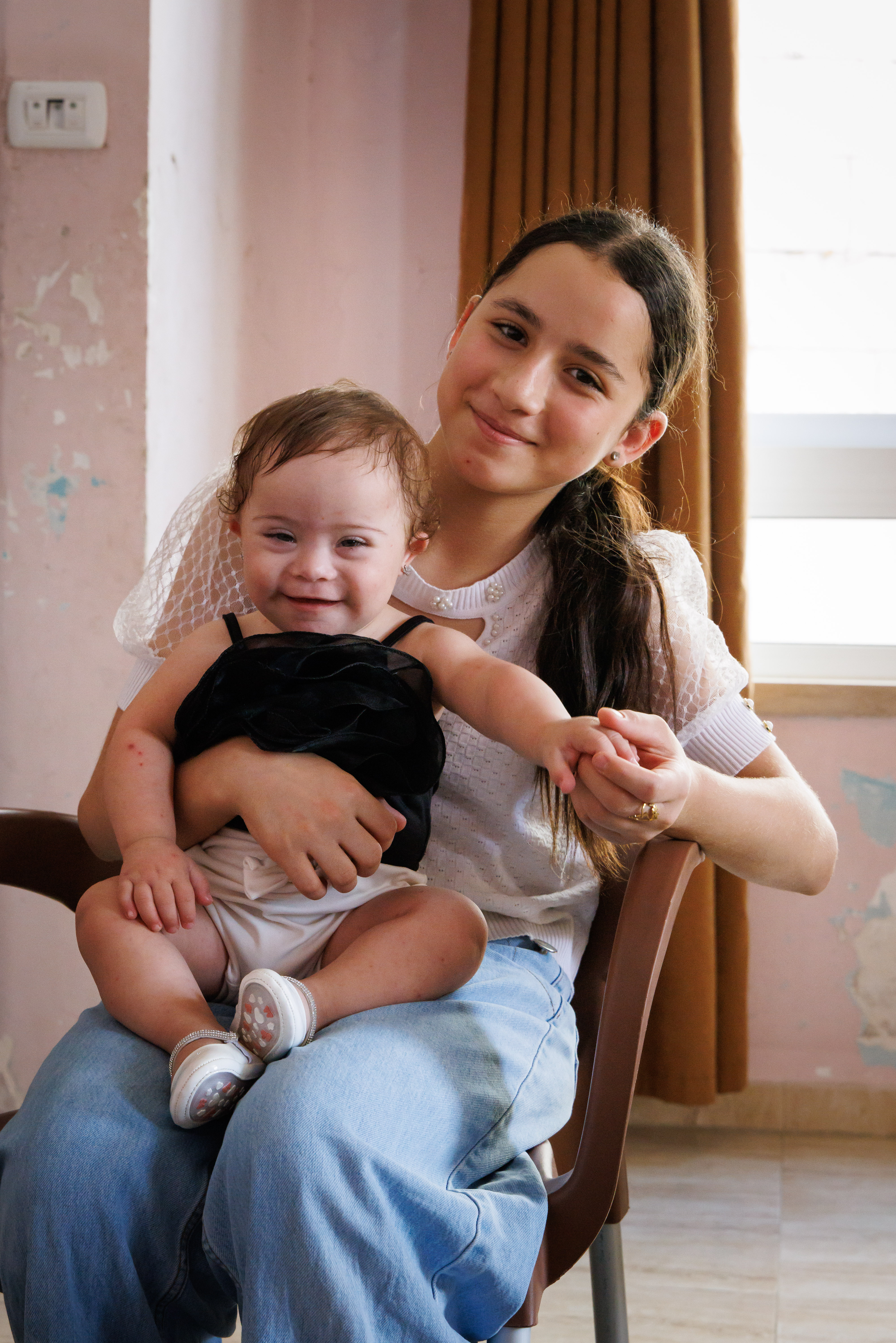 Aya, die ältere Schwester, trägt Karmel auf dem Arm: Liebevoll kümmert sie sich um das jüngste Familienmitglied.